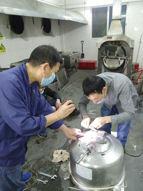 經(jīng)過1個(gè)多小時(shí)的車程,鄒漢基和李左賢趕到現(xiàn)場后,立即開始檢修,經(jīng)檢查確認(rèn)是炒藥機(jī)的溫度傳感器探頭故障,電阻值偏離正常范圍導(dǎo)致傳感溫度失靈,而帶去的探頭都不合用,大家現(xiàn)場商議后,決定將帶去的傳感器探頭檢測元件與原來的探頭檢測元件駁接修復(fù)電阻值,經(jīng)過一番搶修,下午3點(diǎn)14分,故障排除,溫度顯示恢復(fù)正常,看到設(shè)備又可以正常開機(jī)了,大家臉上都露出了欣慰的笑容……