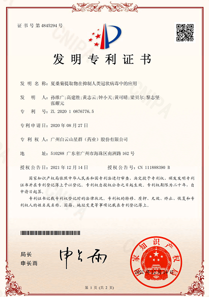 2020年,星群公司與中國中醫(yī)科學(xué)院崔曉蘭教授團(tuán)隊(duì)合作開展的“夏桑菊提取物在抑制人類冠狀病毒中的應(yīng)用”研究成果,當(dāng)年即獲得一項(xiàng)發(fā)明專利授權(quán),2022年又申請(qǐng)了澳門延伸保護(hù),并己獲授權(quán)。