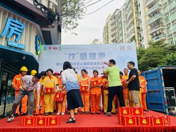 活動現(xiàn)場,白云山星群為環(huán)衛(wèi)工人獻上“星群夏桑菊清涼飲料”防暑物資,感謝他們在夏日酷暑堅守崗位、為城市干凈整潔付出辛勤的勞動。