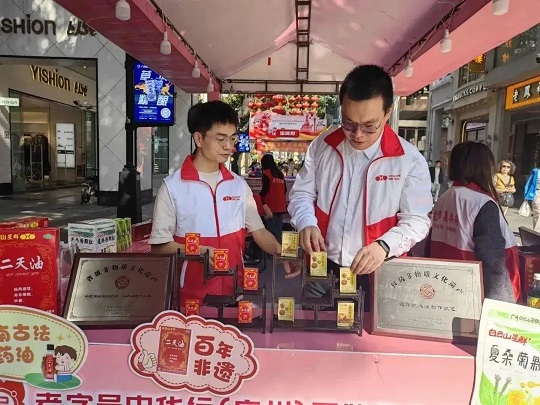 活動現(xiàn)場,白云山星群展示了“三非遺”項目產(chǎn)品:二天油、夏桑菊顆粒、通竅救心油。同時也展示了公司其他明星產(chǎn)品及大健康產(chǎn)品。展現(xiàn)中華老字號以品質(zhì)傳承百年、將傳統(tǒng)技藝代代相傳的品牌文化魅力,讓老字號煥發(fā)新活力,精彩“出圈”!