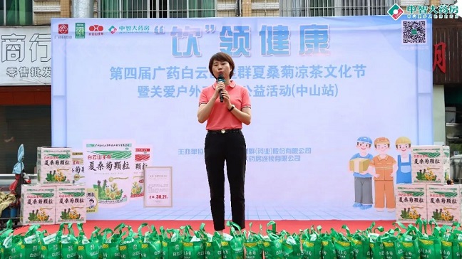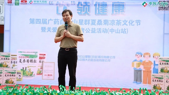 白云山星群公司總經(jīng)理賀慶在臺上致辭:"涼茶作為中國傳統(tǒng)文化的一部分,在炎炎夏日,一杯涼茶不僅能消暑解渴,更能帶來心靈的慰藉。我們白云山星群藥業(yè)將通過舉辦涼茶文化節(jié)的形式,向廣大市民普及涼茶知識,推廣健康生活方式,同時也讓戶外工作者們感受到社會的溫暖與關(guān)懷。白云山星群夏桑菊在涼茶類產(chǎn)品是產(chǎn)品的領(lǐng)導(dǎo)者,占有絕對的市場份額,白云山星群和中山中智在業(yè)務(wù)上保持著強(qiáng)勁的戰(zhàn)略合作伙伴關(guān)系,我們也希望能為廣大消費(fèi)者提供更齊全、更專業(yè)的藥品服務(wù)。關(guān)愛環(huán)衛(wèi)工人,白云山星群藥業(yè)一直在行動,今后,我們也會聯(lián)合更多的連鎖共同開展系列公益活動,為共建和諧美好的社會盡一份力量!”