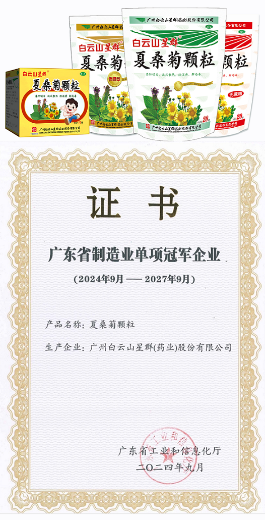 不久前,廣東省工業(yè)和信息化廳公布了一批“廣東省制造業(yè)單項冠軍企業(yè)”名單,其中廣州白云山星群(藥業(yè))股份有限公司憑借多年來在夏桑菊顆粒領(lǐng)域的創(chuàng)新研發(fā)、生產(chǎn)、市場、品質(zhì)等方面的領(lǐng)先優(yōu)勢,榮獲“廣東省制造業(yè)單項冠軍企業(yè)”稱號。
