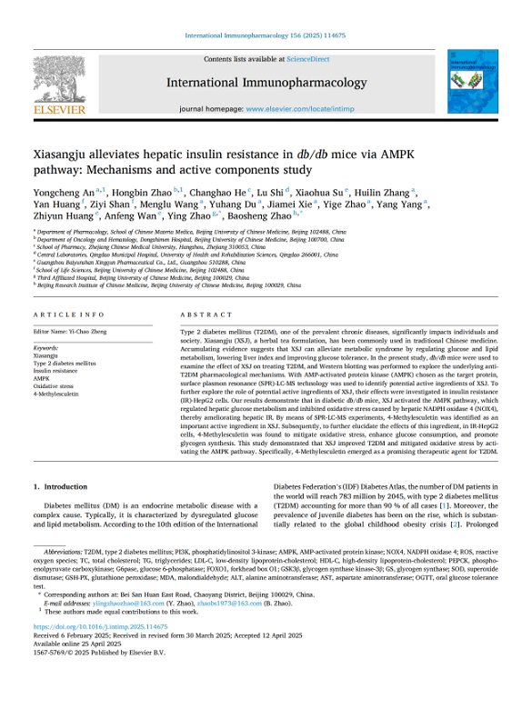 為驗證夏桑菊顆粒的對T2DM的治療作用,星群公司聯(lián)合北京中醫(yī)藥大學共同完成了夏桑菊調控AMPK信號通路改善T2DM肝臟胰島素抵抗的作用機制及潛在活性成分4-甲基七葉亭的研究。本研究首次闡明夏桑菊改善T2DM的作用機制可能通過激活AMPK信號通路,并調控AMPK/NOX4/PI3K/AKT信號網(wǎng)絡實現(xiàn)。通過系統(tǒng)性實驗研究,創(chuàng)新性發(fā)現(xiàn)4-甲基七葉亭是夏桑菊治療糖尿病的關鍵活性成分。該成果不僅揭示了傳統(tǒng)中藥復方的現(xiàn)代藥理學機制,更重要的是為糖尿病創(chuàng)新藥物研發(fā)提供了全新候選化合物和理論依據(jù),對推動中醫(yī)藥現(xiàn)代化和糖尿病防治具有重要的臨床價值與應用前景。