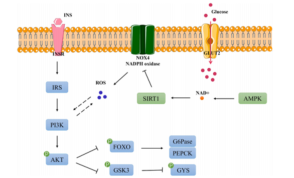 圖為夏桑菊促進糖原代謝的作用機制:通過激活AMPK通路、改善氧化應激、增強PI3K/AKT胰島素信號傳導及提升肝糖原合成能力,從而改善肝臟胰島素抵抗并治療2型糖尿病。