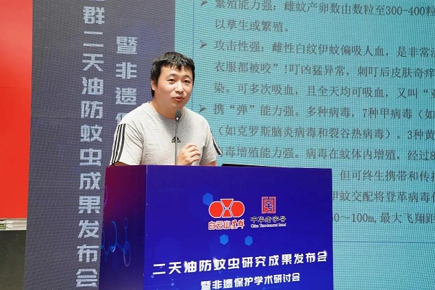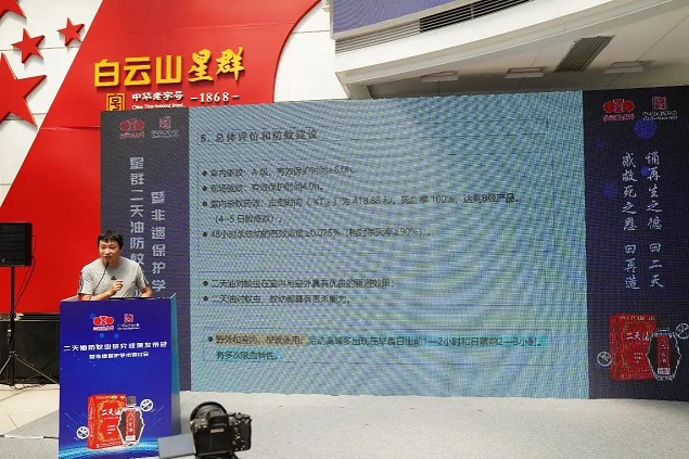 毛潤乾團隊成員陳大嵩博士為與會嘉賓重點講解了《二天油防蚊叮咬成果報告》,毛潤乾團隊實驗研究顯示,在二天油室內(nèi)驅(qū)蚊藥效試驗中,星群嚴(yán)格參照國標(biāo)GB/T 13917.9-2009測試,證明在涂抹1.5µl/cm²星群二天油,能對傳播基孔肯雅熱與登革熱的“元兇”——白紋伊蚊形成長達6小時的強力驅(qū)避;而依據(jù)國標(biāo)GB/T 13917.6-2009測試,星群二天油對白紋伊蚊的致死率高達100%,KT50值(擊倒半數(shù)蚊蟲時間)僅需6.98分鐘。此外,參照國標(biāo)GB/T 31711-2015測試,星群二天油實現(xiàn)48小時內(nèi)殺滅90%以上的幼蟲,僅需0.025%的低濃度。