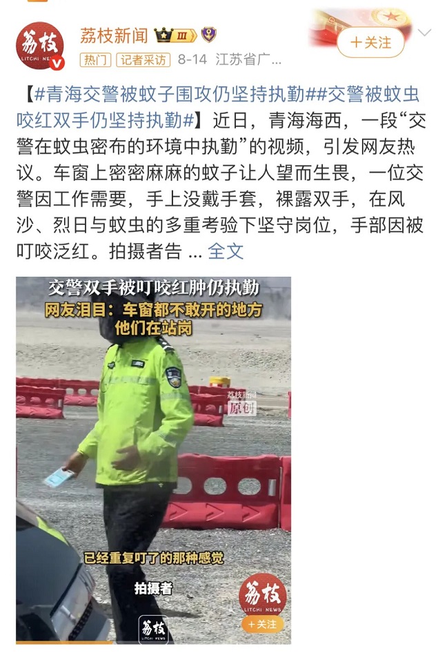 8 月中旬,一則關(guān)于青海交警執(zhí)勤時身上叮滿蚊子的新聞在網(wǎng)絡上引起熱議:畫面中,交警身著制服堅守崗位,密密麻麻的蚊子叮滿衣服,他們只能不停抖動將衣服上的蚊子抖落。哪怕雙手被蚊子叮咬紅腫,仍然堅持執(zhí)勤,從不懈怠。這一幕讓無數(shù)網(wǎng)友心疼不已,也讓更多人關(guān)注到高原地區(qū)公安民輔警的艱辛日常。盡管當前蚊蟲高峰期已過,但在海西州這片廣袤的土地上,公安民輔警 “戰(zhàn)風沙、斗烈日、抗蚊蟲” 的堅守從未停歇 —— 他們頂風冒雪堅守路口疏導交通,頂著烈日在平直路段維護秩序,提醒游客避免疲勞駕駛,在蚊蟲密布的野外開展巡邏防控,用日復一日的執(zhí)著,筑起守護群眾平安的堅固防線。