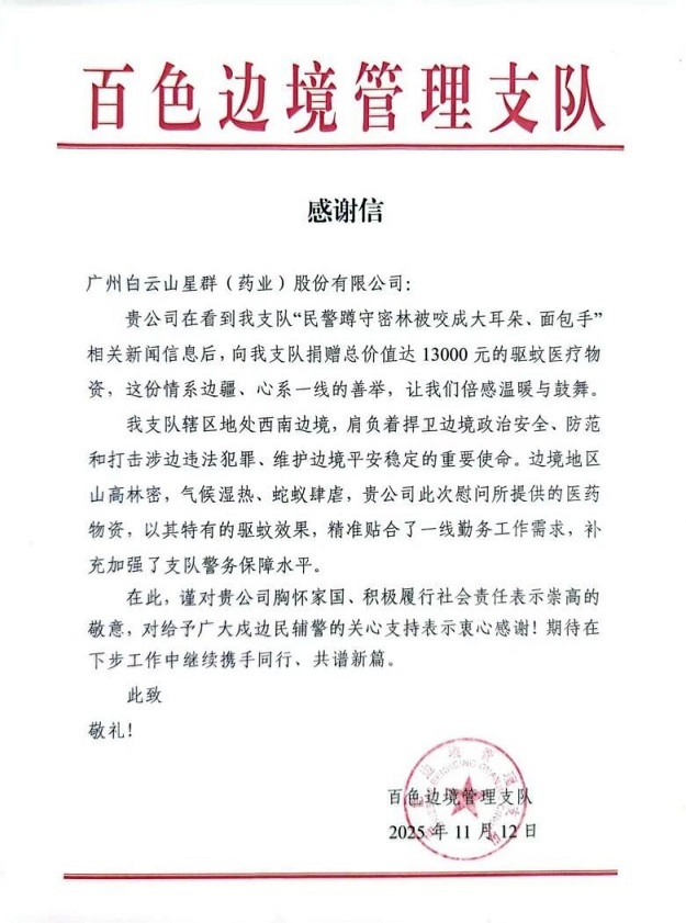在祖國南疆的邊境線上,沒有繁華喧囂,只有日復(fù)一日的堅(jiān)守;沒有驚天動(dòng)地的壯舉,卻有“面包手”撐國門、“大耳朵”護(hù)安寧的赤誠。邊防民警們把青春獻(xiàn)給邊疆,把安危置之度外,用每一次巡邏、每一次偵查、每一次堅(jiān)守,詮釋著“為國戍邊”的奉獻(xiàn)精神 —— 他們是蚊蟲叮咬下仍咬牙堅(jiān)持的勇者,是高溫酷暑中仍步履不停的守護(hù)者,是夜幕降臨時(shí)仍警惕守望的國門衛(wèi)士。星群公司此次慰問,不過是社會(huì)各界致敬這份奉獻(xiàn)的一個(gè)縮影:我們或許無法替他們直面風(fēng)雨,但愿用最實(shí)用的保障,為他們驅(qū)散蚊蟲、擊退暑熱,向每一位以青春赴使命、以熱血護(hù)家國的邊防民警致敬!愿這份跨越山海的牽掛與支持,化作他們戍邊路上的堅(jiān)實(shí)后盾。